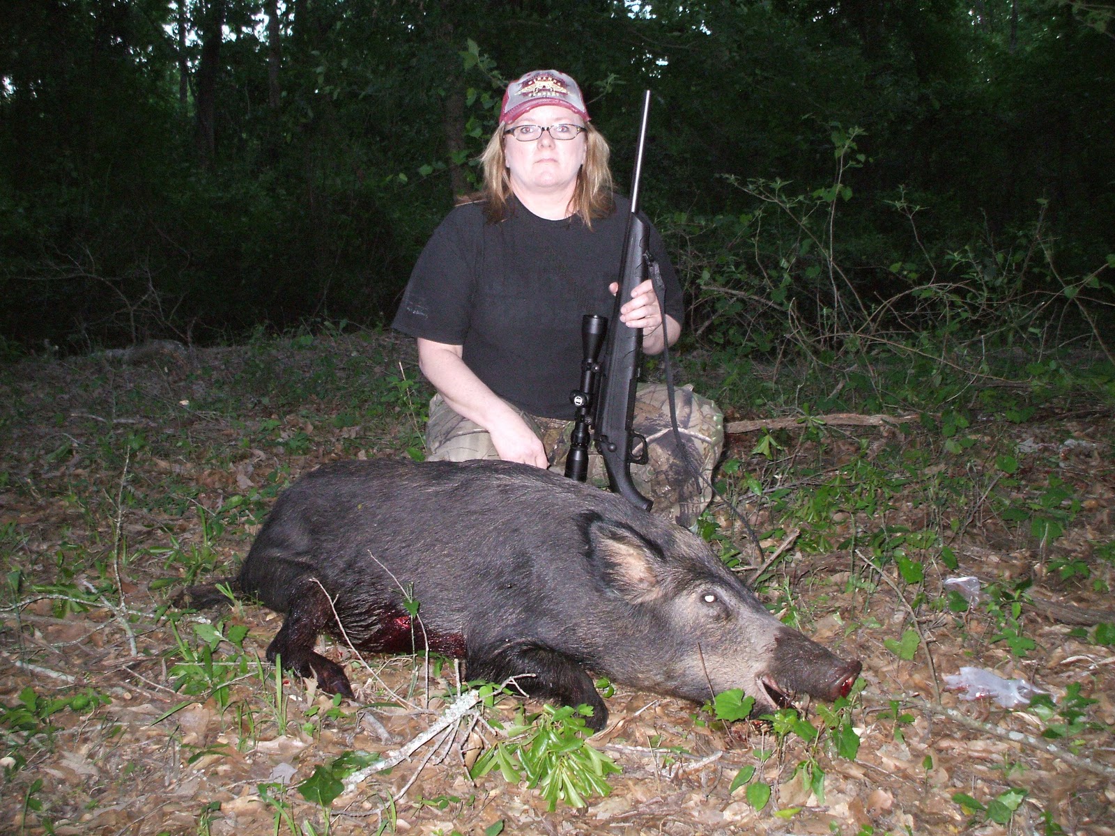 Sure enough, we pack up and make our way noisily toward the feeder on our way back to the truck. Suddenly a pig darts from behind a bush and runs away from us. I quickly reload my rifle thinking that if there was one, there are probably others. We are talking about it when I see a couple of ears sticking up over some bushes about 25 yards away. “There’s one,” I say to my husband as I lift my rifle. About that time, he tells me he sees some piglets. I point my rifle and shoot. A split second later, there is a blast from his shotgun. I see a spray from my target as it takes off running. The piglet my husband has shot begins screaming and thrashing around.