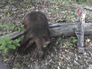 . . .but my hubby doesn’t think so. He was so proud when he came home the other day proclaiming that he had shot yet another wild pig with his Martin Firecat bow and Rage Broadhead! Since he was alone on his hunting expedition–believe me, if it is warmer than 80 degrees out, I am not interested–he took the photo of the pig alone. This population of pigs has been forced to hang out near the creek because it has been so dry and hot. Lucky for us!