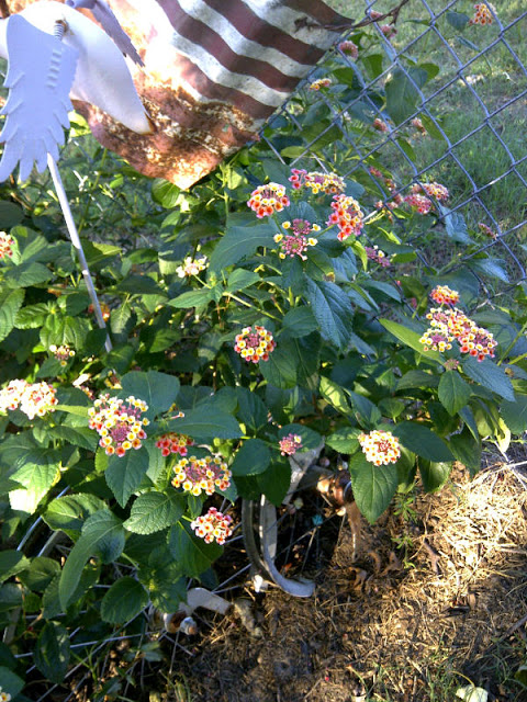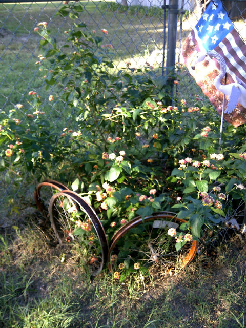 Remember that day when I showed you how I (or my mother) planted a special lantana flowering plant in my backyard and bordered it with old bicycle rims? My sister who now lives in Indiana sent it to me as a get well gift after my hysterectomy in May. It started life in a plastic hanging basket and almost died before I was able to rescue it from my porch where the floral delivery van left it.