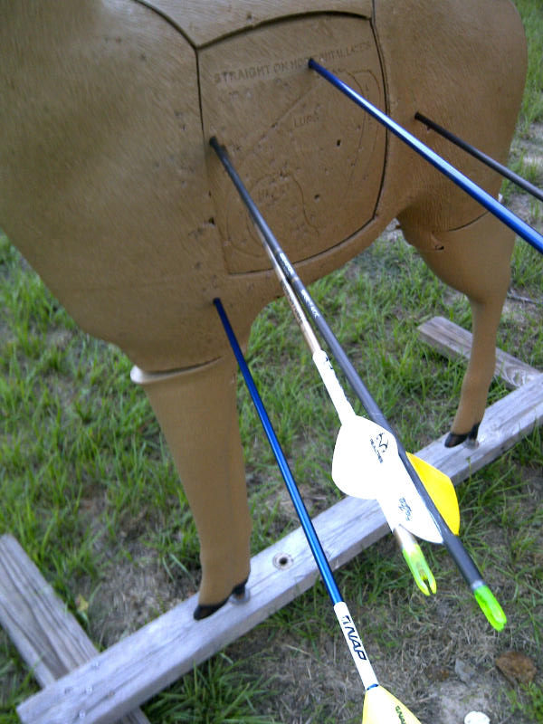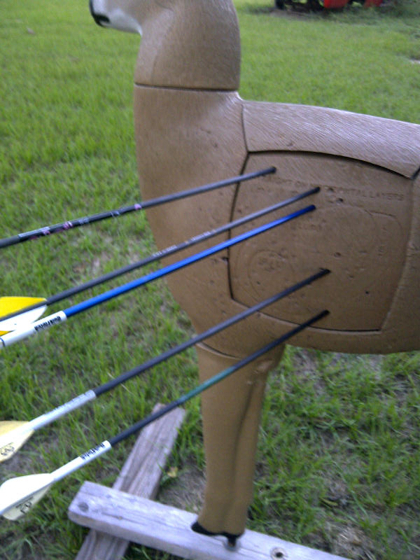 I think I would have gotten this buck if it had been real. It may have taken awhile to track it, though. Those arrows are random. They are some old ones my hubby used to shoot. He might break a tip and then he trims it down and gives it to me. I save my pretty pink ones for the archery shop range. I have some pink Ted Nugent Goldtip zebra arrows with Rage broadheads for the real hunt.