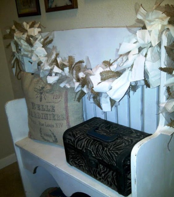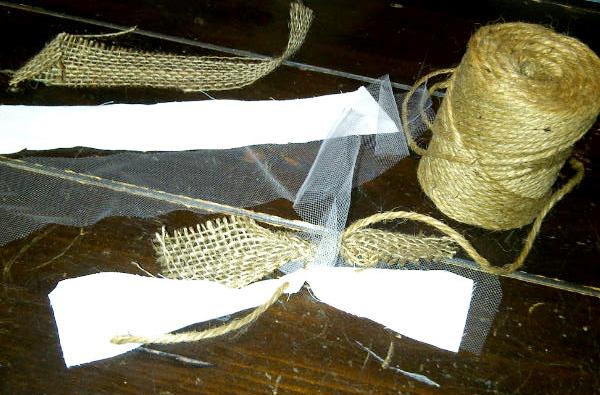 You just tie the strips onto the twine. I used two strips of cotton and tulle for every strip of burlap.