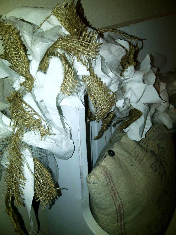 I’m getting there, though! I saw a garland at a bridal show a few months ago, and I actually made one myself! Not bad, if I do say so myself, and much better than the price tag of the one at the show. And I paid practically nothing: I had the twine, the $18 100 ft. burlap roll, the free tulle, and the 10 cent white cotton sheet.