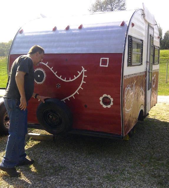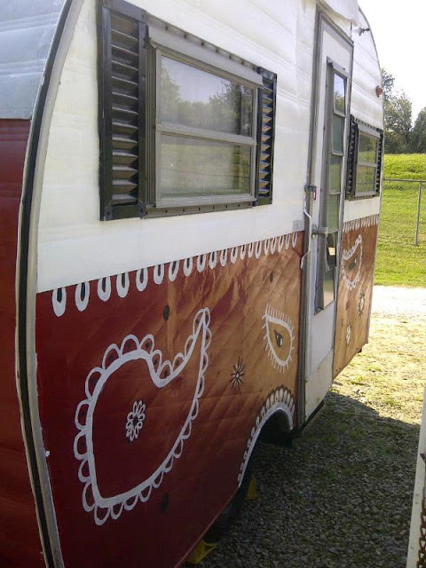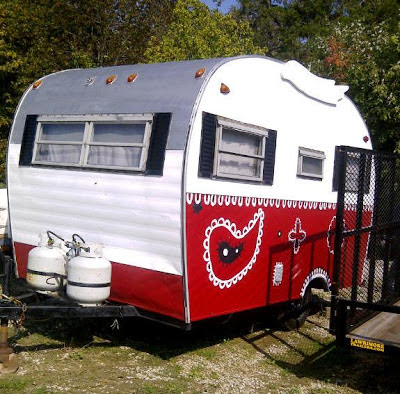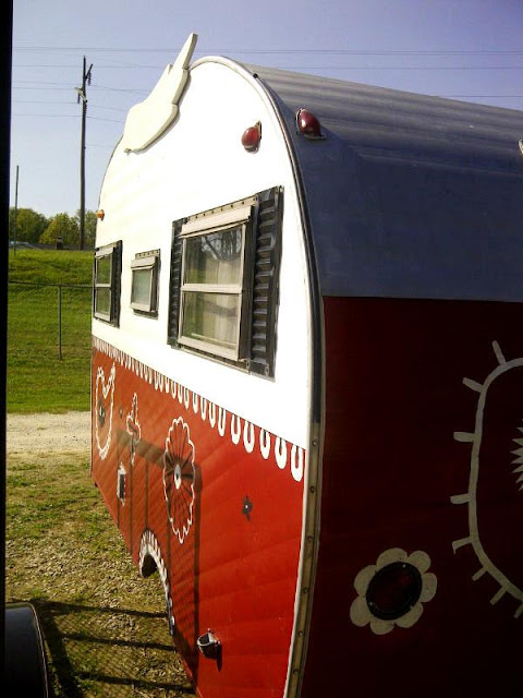 But already having a teeny trailer does not my infatuation lessen. During our recent trip to Indiana my sister told me about a little camper decorated like a bandanna in a lot on the way to the local Walmart. I tried to imagine what it must look like, but I wasn’t prepared for the extreme cuteness factor. She drove slowly by and I spotted it, which elicited my usual squeal. Like the wonderful sister she is, she informed her husband that they must stop and let April (that’s me) look at it.