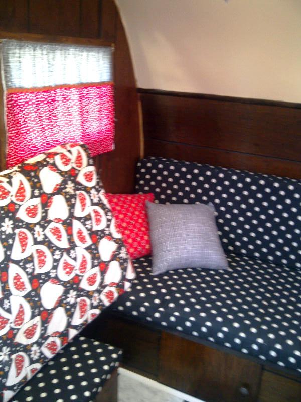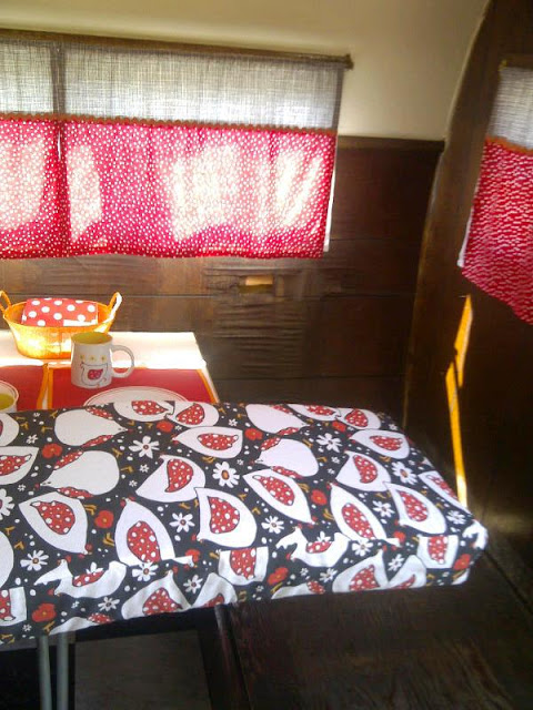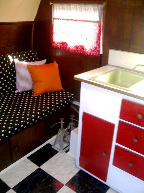 I LOVE the color scheme! The black and white tiles, the polka dots and the chicken print cushions. . .amazing! As you can see in the middle interior photo, there is some water damage below the window, but it could be repaired and the window sealed.