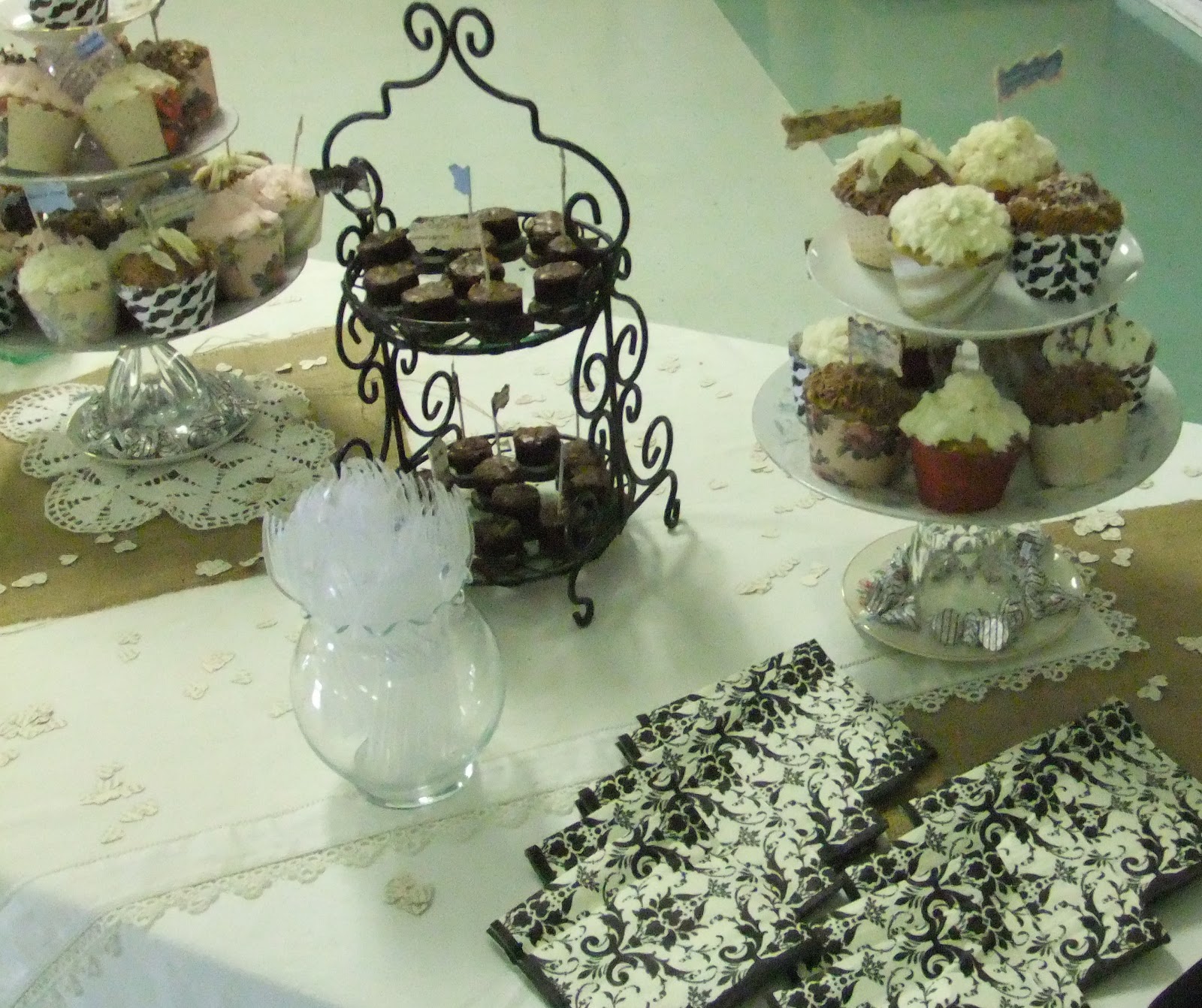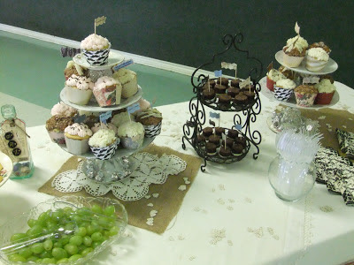 Sharon made all the cupcakes and wrapped the liners with pieces of scrapbook paper she cut to fit. She made the top hat brownies by setting circular brownies on top of a round chocolate wafer cookies topped with icing. She also printed Victorian love quotes on bits of scrapbook paper that she made little flags out of.