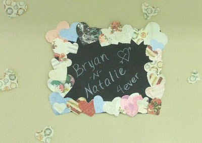 To add interest, my sister also did quotes on pieces of black poster paper framed by heart cutouts which she pinned to the bulletin boards already in place in the church fellowship hall where the shower was held. . .