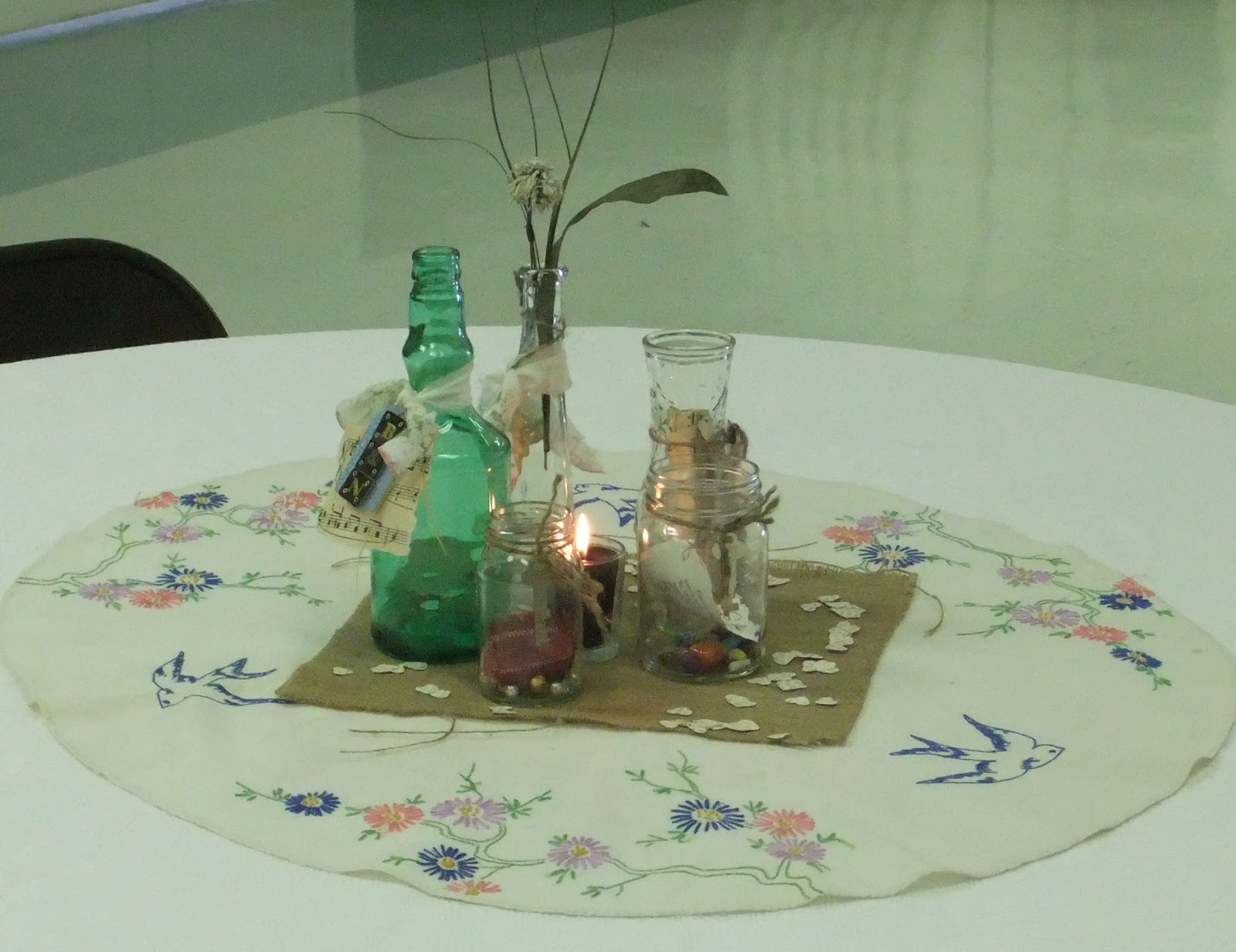 Other creative touches included table centerpieces consisting of vintage bottles embellished and filled with bits of paper, beads, music, etc. She also placed a candle with the bottles on burlap squares and topped each table with a vintage tablecloth.