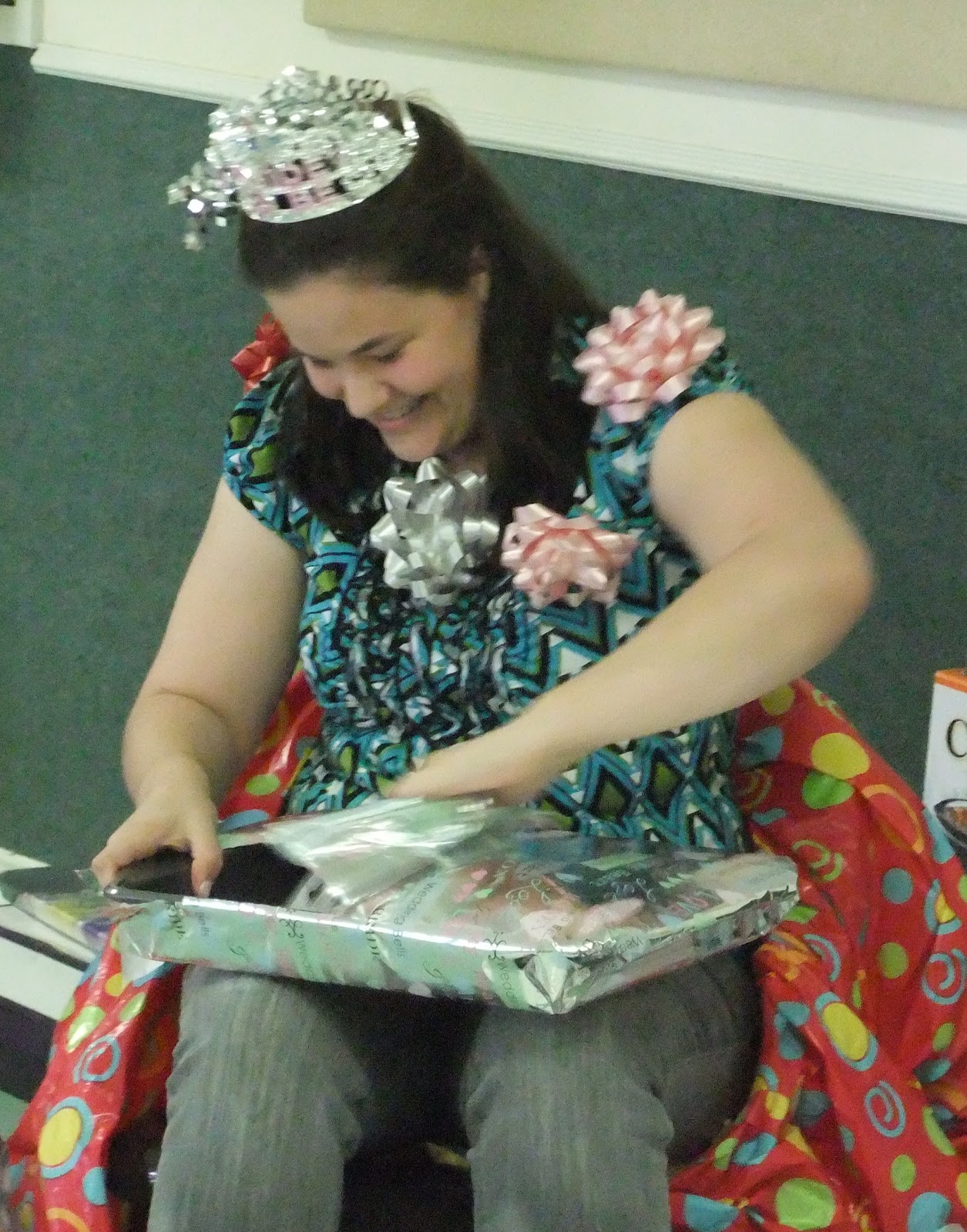 My mother sat behind Natalie to help her with the wrappings, and my niece (Sharon’s daughter) Libbie handed Natalie the gifts one by one to unwrap.