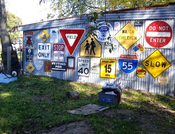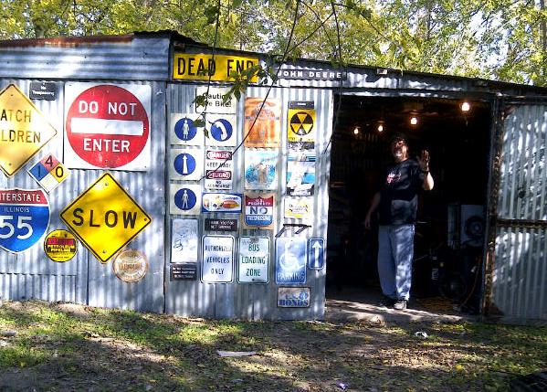 Well, here are some photos of hubby’s man cave. Yes, that is Jimmy in the doorway. He has covered the backyard shed with old signs and made it uniquely his. Once a sheriff’s deputy stopped to ask where the old signs came from (have you heard of Canton?) and then once a mother asked permission to take photos of her daughter in front of the shed. Maybe some photos of the bride and groom might be in order. . .