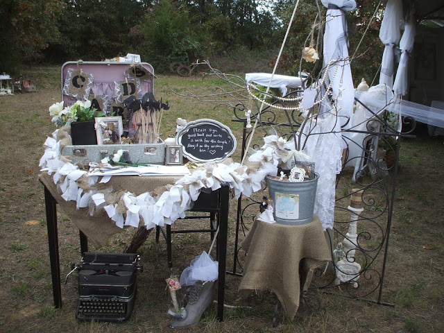 In this next photo you can see the entire guest book table, which was set up on a small desk I found at Goodwill for less than $10. Underneath the table is my antique typewriter–not quite a steal for $45 at my favorite antique shop, but better than a lot of places. I got the cement Victorian boot for half price at Hobby Lobby because it had some chipped places, but those increased its value for me! The wishing tree is just a few pieces of branches that fell from our trees in the backyard. I stuck them into an old antique store bucket and filled it with some pea gravel my mother had. I added some small framed photos of the couple and another cake topper. An old string of fake pearls finished it off. The tree sat on a burlap-covered wrought iron plant stand. Behind that was an iron wall gate with an antique wedding veil, another Goodwill find. The gate was a gift from a friend. Charming vignette!
