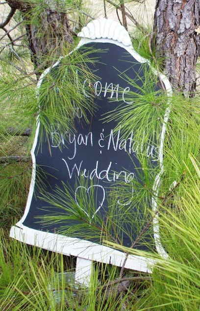 More ivory spray paint, a couple of layers of chalkboard paint, and a welcome message in chalk, and it made a perfect welcome to the wedding. I tucked it under the low-hanging branches of a pine tree and anchored the base in a small galvanized bucket. So easy, so cheap, so vintage.