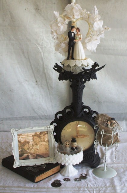 Here is another little vignette I made for the hors d’oeuvres table from an antique clock lamp, some vintage cake toppers, a framed photo, and an old book. I also added a milk glass compote dish, a wire votive holder with crystals, and a few steampunk gears and keys. A vintage wedding cake topper perches on the top of the lamp base, which has the time of the wedding on the clock: 3:00. The green lamp I spray painted black.