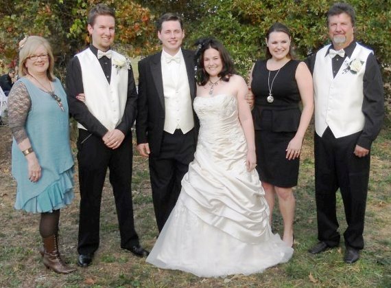 A photo of the bride’s happy family shows that we chose to clothe the father of the bride and best man (the bride’s brother) in plain black shirts and slacks of their own. They had to rent only the vests and bow ties. My daughter-in-law as the matron of honor was asked to wear a black dress of her choice, and I picked out a casual outfit I can wear anywhere after the wedding. No one in the wedding party had to spend very much.