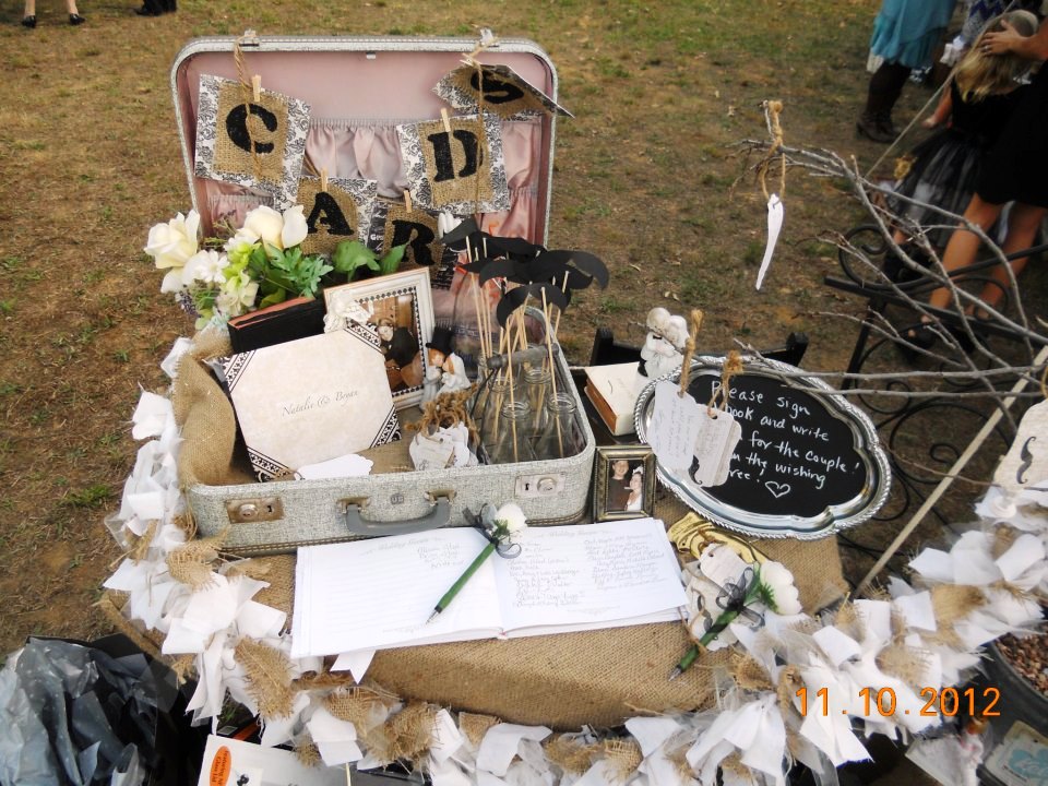 This is an example of the outdoor wedding decor. Thrift store purchases and home crafts such as the vintage suitcase, silver-plated chalkboard tray, Goodwill guest book, homemade flower pens, and homemade rag garland sit on top a simple desk from a thrift store. Much of the decor came from my own home.