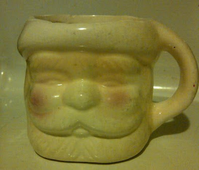 | An old Santa mug with all the red color rubbed off. . .perfect for my white Christmas decor! And he was free! |