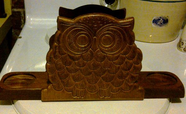 | A polished wooden owl napkin holder with spaces for salt and pepper shakers. . .my daughter stole this from me! |