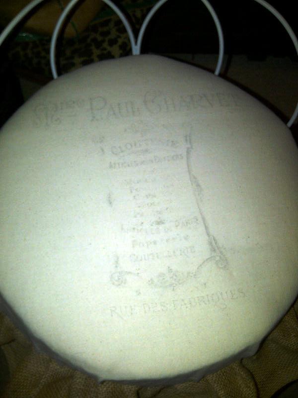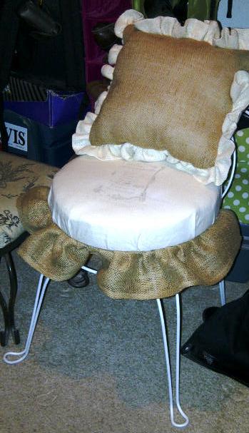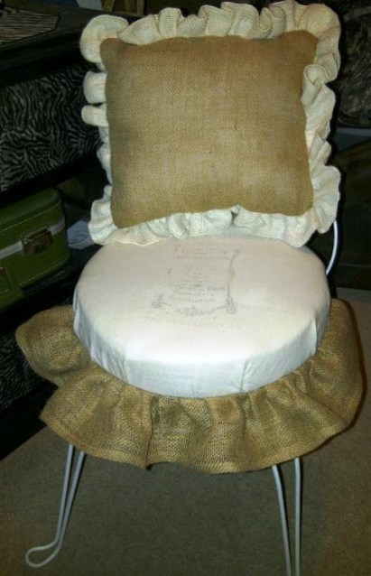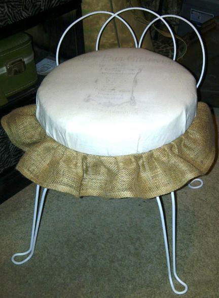 Today I wanted to share something that my sister gave me for my birthday a few weeks ago. She refashioned this little vanity stool from an old one she found for practically nothing. She repainted it, recovered it with muslin fabric that she stamped herself using art from The Graphics Fairy, and added the burlap ruffle she sewed herself. Then she added a cute burlap and muslin pillow she made.