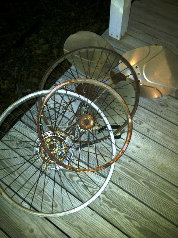 | Some motorcycle and bicycle wheels and an auto fan blade. |