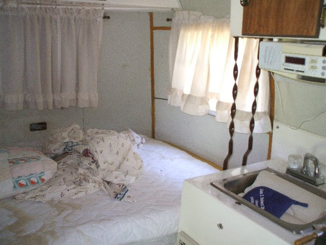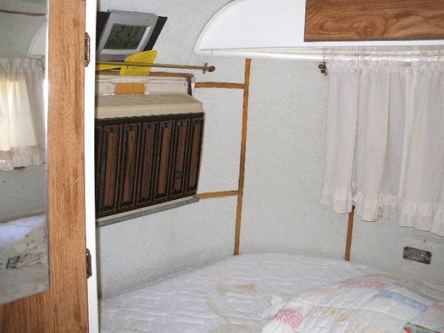 Poor little bedroom area. Hubby and I removed the mattress, cushions, curtains, stripping her down. Note the dirty white Ensolite walls with the yellowed tape strips.