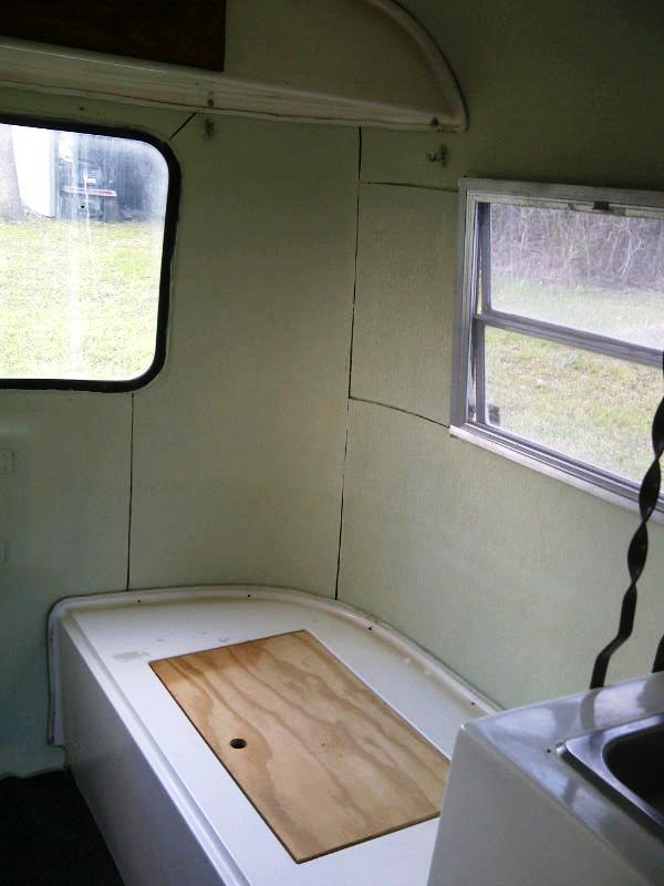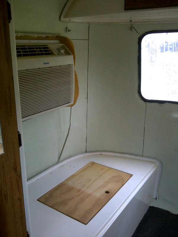 The fiberglass compartment provides storage and covers wiring. Hubby lifted it out to install new carpeting. Note the new light sage walls. The yellowed tape has been removed and will be replaced by flexible white caulking. New cushion covers will be added to the top of the compartment, providing a base for a newly designed bedroom area which can double as a dining area if I like.