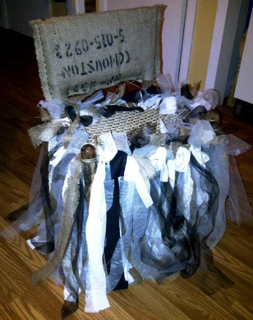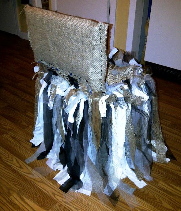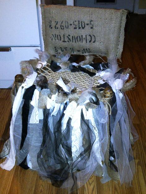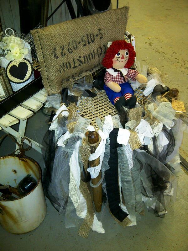 And this is what it looks like now. I have been making rag curtains for my Etsy shop, A.C. Junk ‘n’ Stuff (acoker59), and thought a rag curtain bottom would look cute on this chair. I cut strips of old curtains, burlap tree wrap, sheets, and tulle and tied each strip to jute twine, which was then tied to the chair legs.