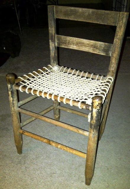So this is what the chair looked like underneath. You can see where the top rung was sawed off. I love the rustic-ness of the chair! I wonder if the roping is original.