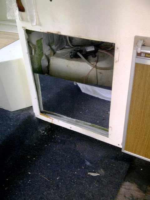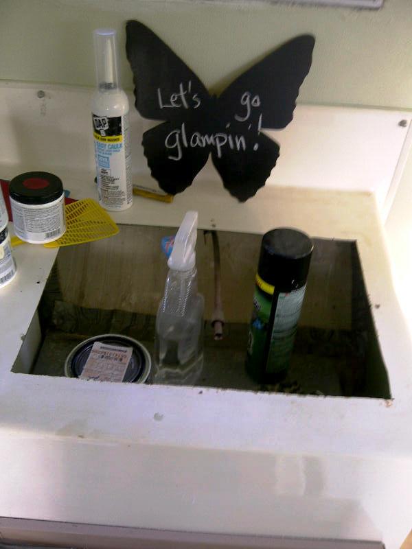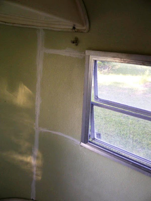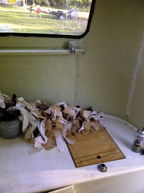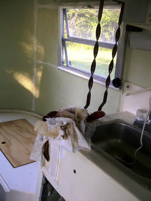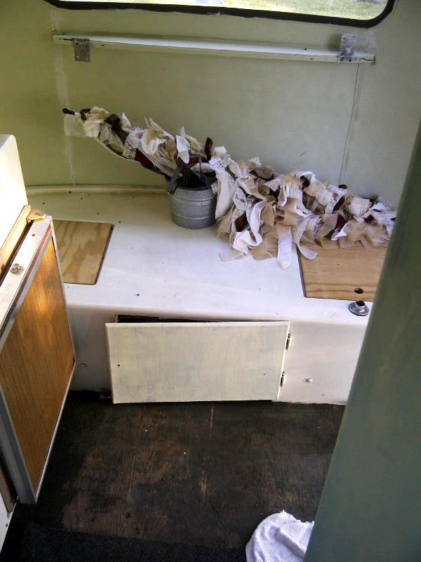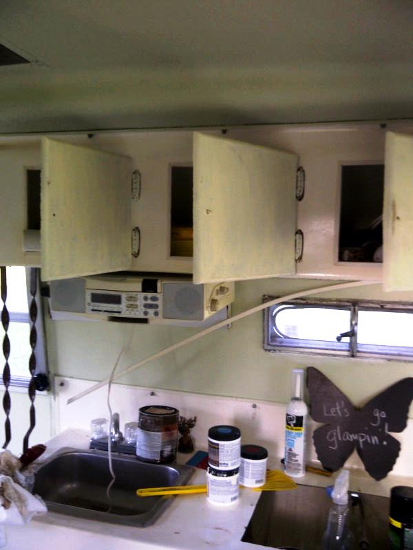 I primed the cabinet doors which will be painted red to match the upholstery fabric. That hole in the countertop was where the cooktop stove used to be. It will be covered with a board and a microwave oven.