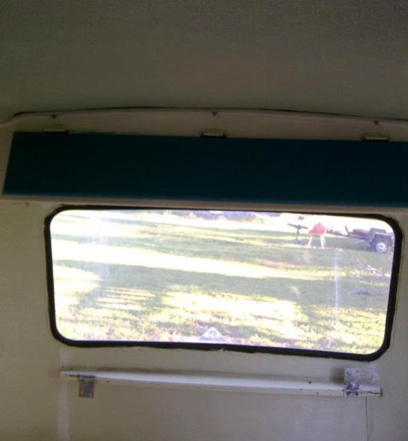 The cupboards over the bed and bench, and the potty chair door, will be painted turquoise.