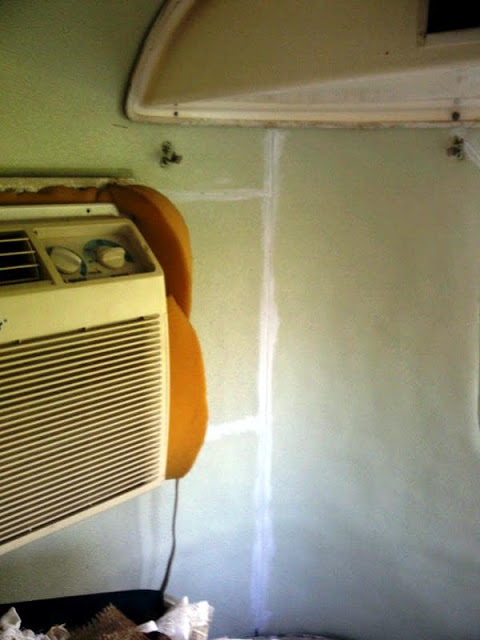 When the caulk is dry I will go in and paint it the same color as the walls. Yes, I know that foam around the air conditioning unit is ridiculous. It was a temporary fix until I can get in there and trim it to fit.