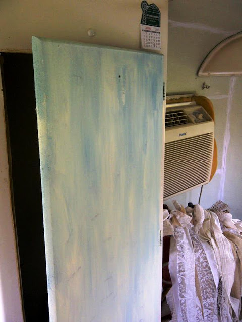 This is the door to the closet primed and ready for red paint. Some turquoise paint was left on the paintbrush but it will be repainted anyway.