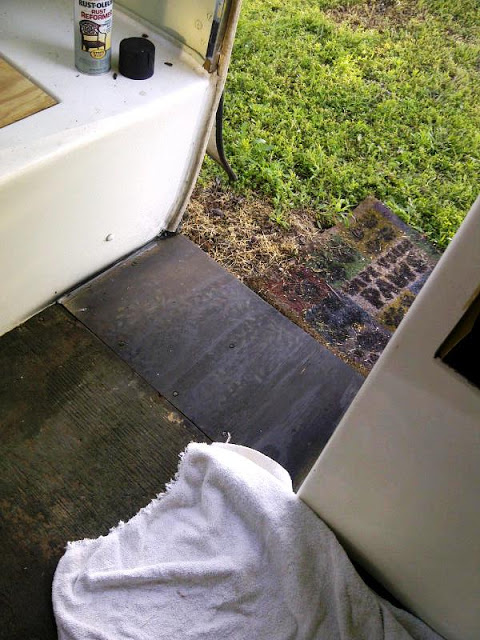 Hubby had to extend the floor in front of the door because the door was bent out a bit. It was much easier to fix it that way than to try and bend the door back. We just need to add a threshold and carpet now.