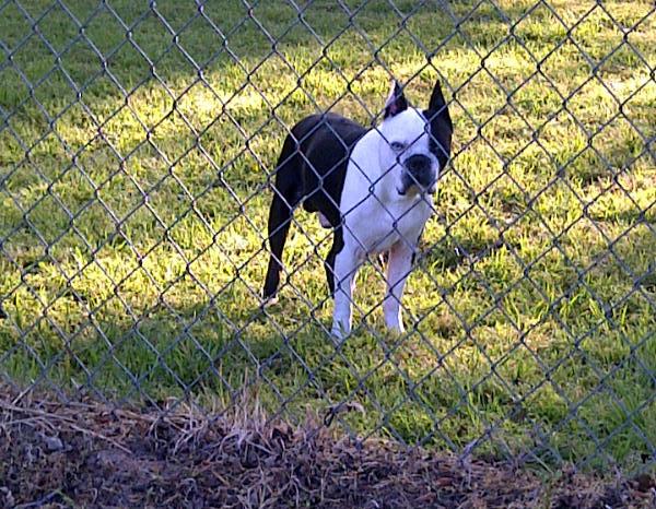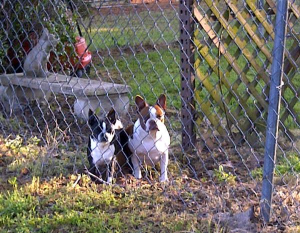 Molly (left) and Maggie, two of our Boston terriers, watch Lucy from the backyard.