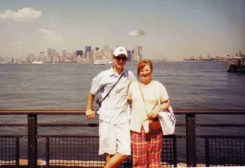 | On Liberty Island with Manhattan behind us. Gotta love those plaid pants! And I was a redhead back in those days. . . |