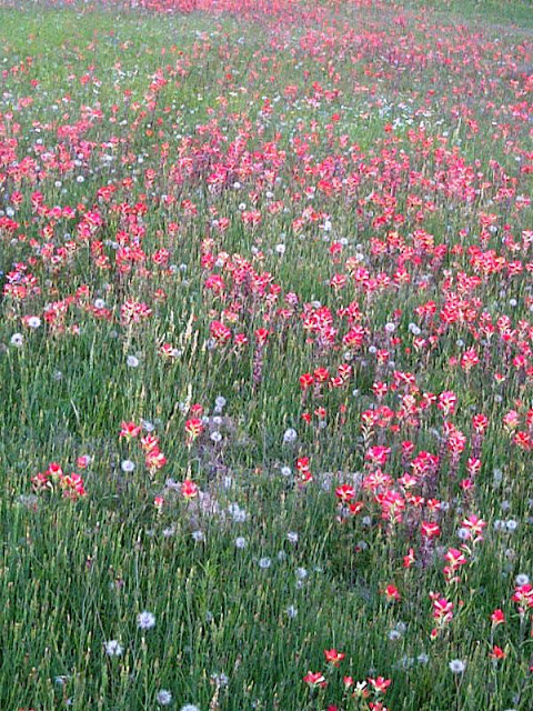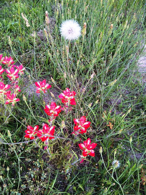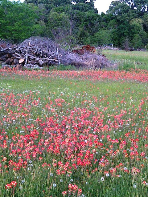 Contrary to what most people believe, including Texans, bluebonnets do NOT grow everywhere in Texas. East Texas, with all its virtues and attributes, was left out when God decided where to plant His beautiful bluebonnet. But He did give us just-as-pretty Indian paintbrush, and we are lucky enough to have a glorious patch of these right in our backyard! (Actually, our back pasture, if you want to get technical.)