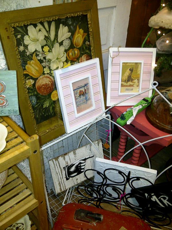 Some of her cool shabby framed pieces, along with some ironwork and my signs.