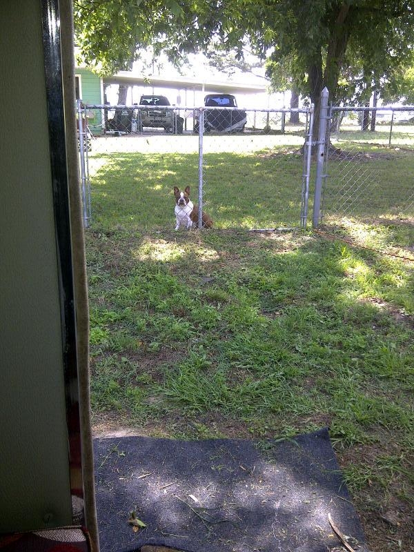 Little Maggie waits for me to return to the house. This is the view from the front bench of the trailer.