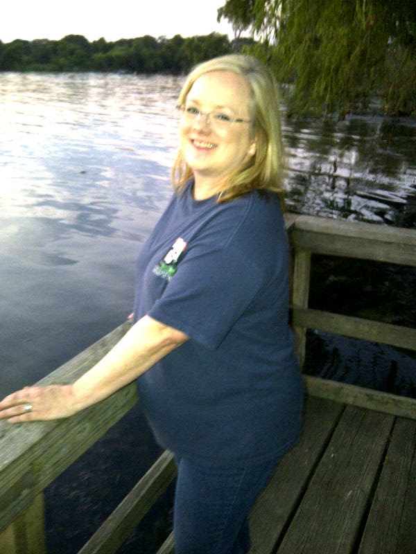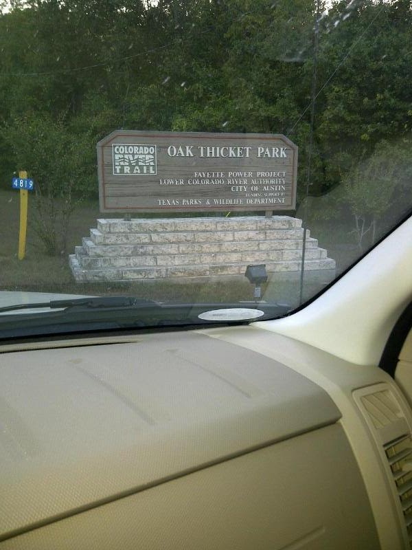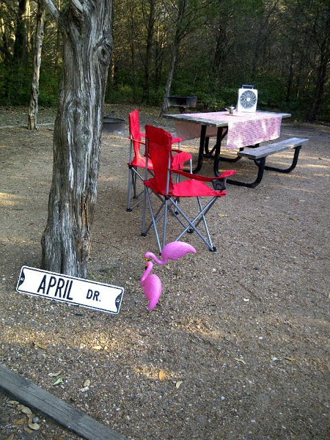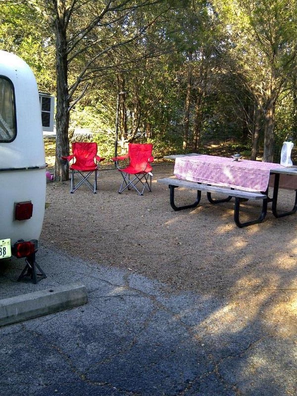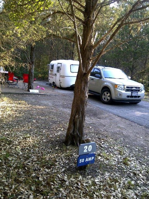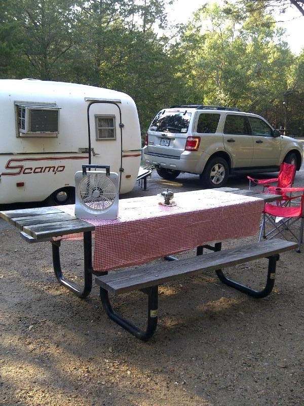 After about 200 more miles and only one more stop to stretch our legs, we finally arrived at our campground, Oak Thicket Park on Lake Fayette near LaGrange. I practiced unhooking the trailer from the hitch, leveling the trailer, and hooking up the electricity. Then I set up our chairs and decorated the picnic table and driveway while Jimmy fixed a tail light that decided to stop working. In 98 degree heat, it wasn’t much fun for him, but he didn’t complain. Much.