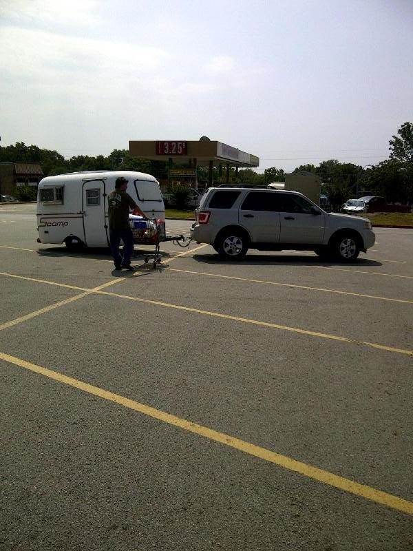 Of course, no trip is complete without a trip to Walmart. There are always things forgotten or needed. In this case it was a fire extinguisher, a jack, wheel chocks, folding chairs, snacks, bottled water, and soda. Here is Jimmy walking ahead of me to the back corner of the parking lot where he thought it was safe for me to park. : )