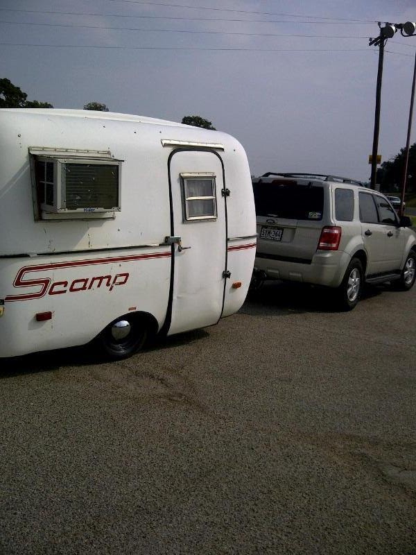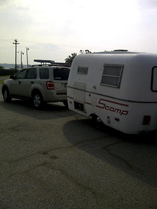 After three years of fixing, waiting, and more fixing, hubby and I finally got to test Scampin’ Annie on a real honest-to-goodness camping trip. This is the first photo we have taken of her away from home turf! Unfortunately, about 35 miles down the road, we noticed that we had already lost a part off her! At least it wasn’t a vital one–just a vent grille from behind her refrigerator. But it hurt my pride and Annie’s. She had to make the rest of the journey with a gaping hole in her side!