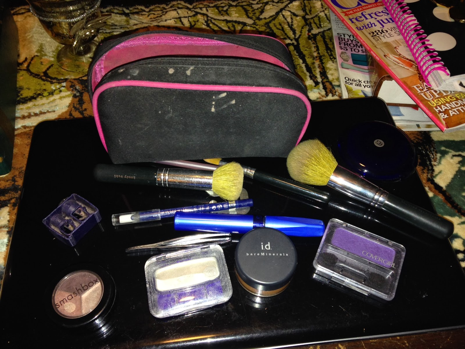 As I use each item, it goes back into my cosmetic bag. This habit keeps me from forgetting any item. Who wants to go to work without mascara or blush or worse, only one eye made up? Horrors!