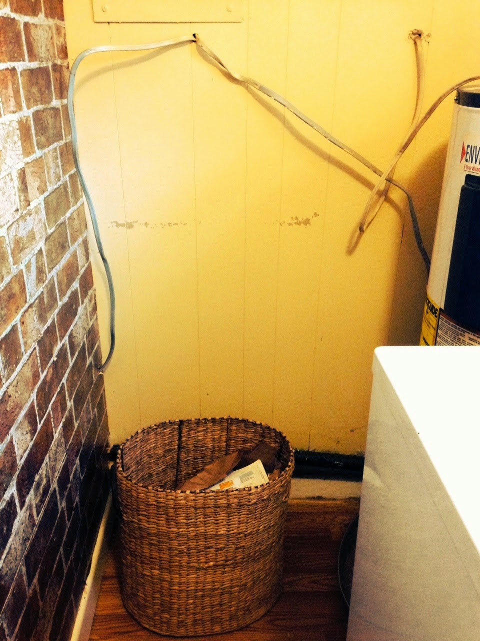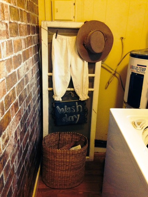 It’s a teeny room only big enough for the washer and dryer, the back door, the door to the kitchen, and the door to the utility closet. The water heater sits in the corner next to the washer and dryer with its huge wires spidering across the wall, installed by men who didn’t give a hoot for esthetics, leaving the lady of the house to throw up her hands in despair and hope no one entering or leaving would notice.