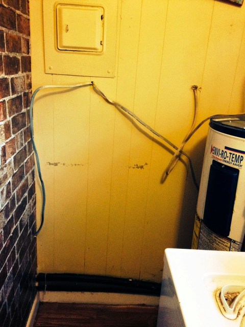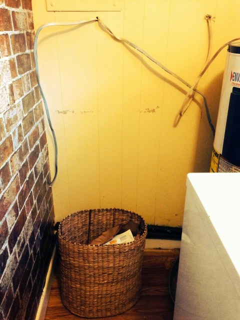 Could the gigantic holes for those heavy cables be hidden behind the water heater itself? Or lower toward the floor? Probably. But I’ve never been able to interest anyone in trying to relocate them. This is what I have lived with for 28 years.