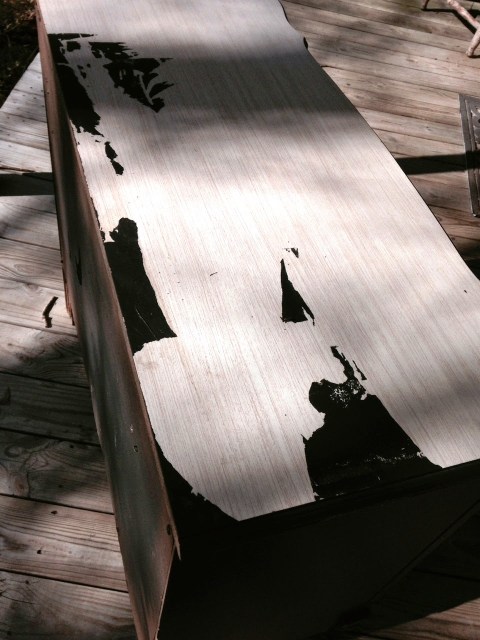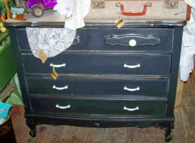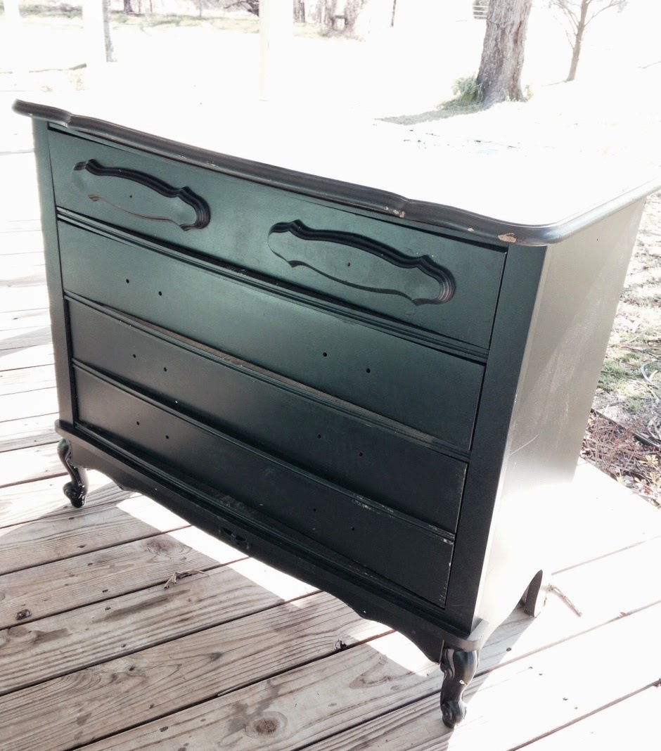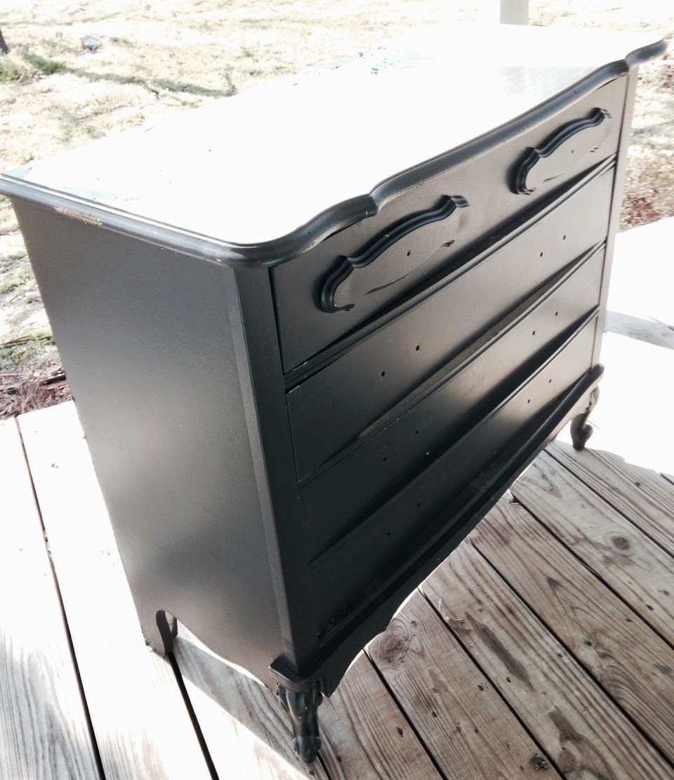 It was forlorn. It had some stuff on its laminate top that looked like someone had tried to remove it, some kind of felt that had been glued on. There were no knobs or handles on the drawers, and I could only get one drawer open. There were also scraped places on the black paint, and a bit of what seemed to be yellow spray paint on one drawer ledge. But still. . .