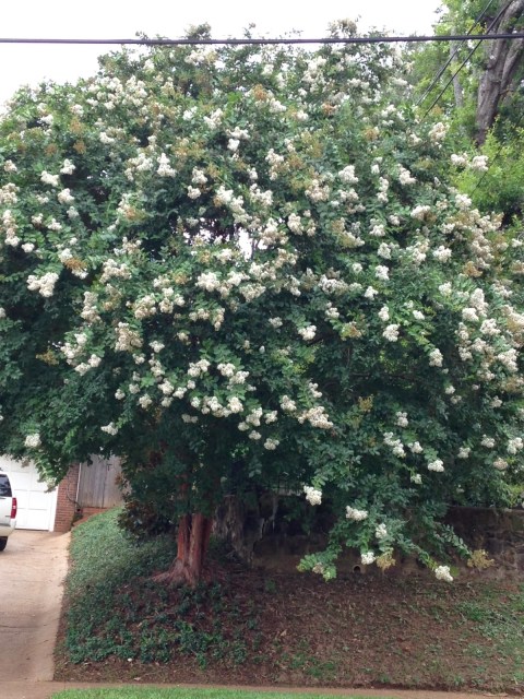 Crepe myrtles come in white, pink, purple, and lavender. I’m wanting a white one now since I noticed how much they look like fireworks when the tree is blooming. Hopefully I won’t forget to get one for fall planting!