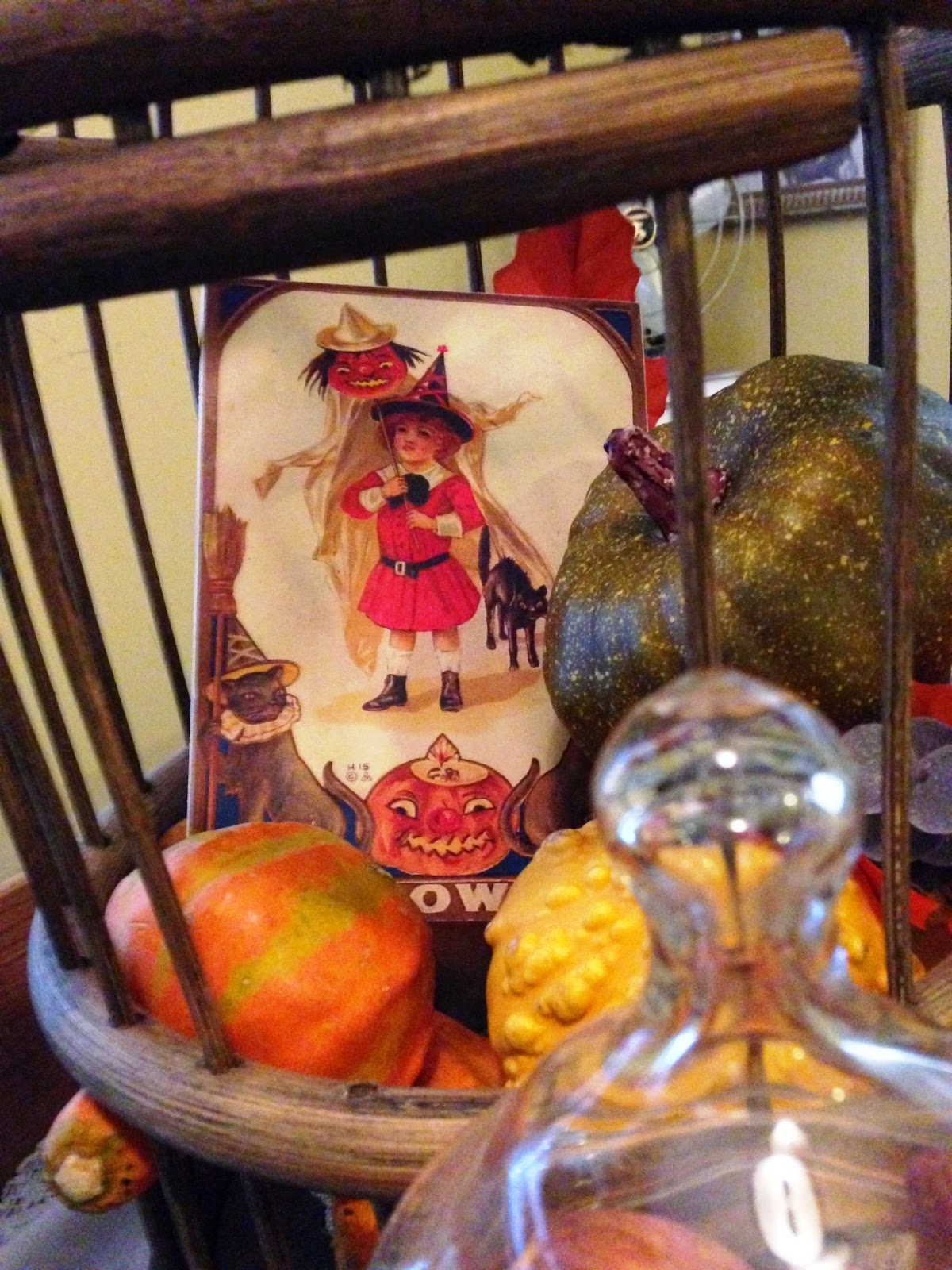 This vintage-style Halloween card sits inside the birdcage on my dining table