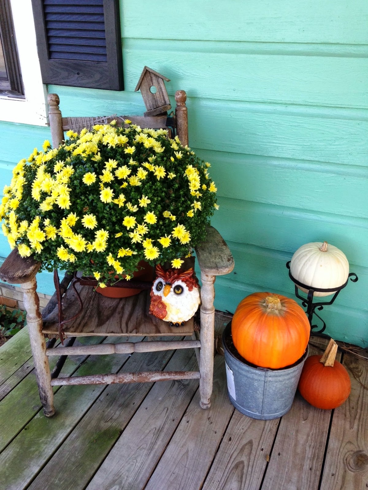 | My front porch vignette. Can you guess which pumpkin is not real? (It’s the biggest one!) |