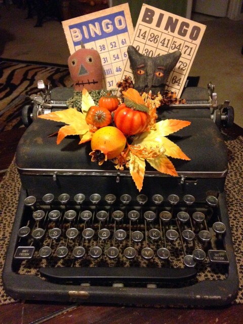 This typewriter was a Goodwill find decorated with flea market Bingo cards, primitive Halloween ornaments from an antique mall, and faux fall foliage.