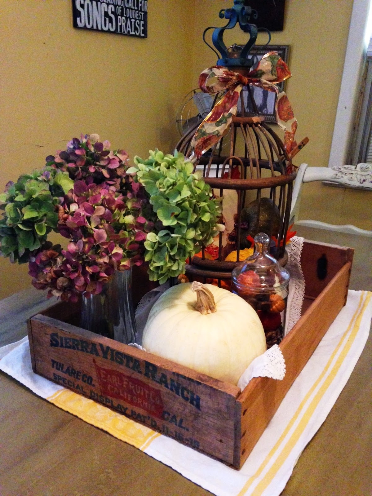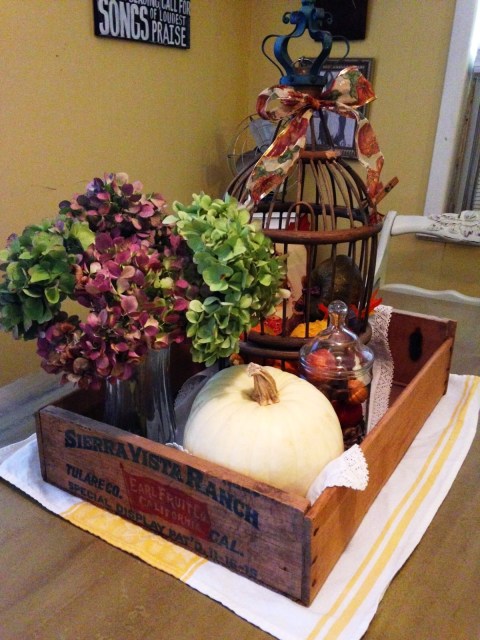 | A garage sale box filled with a thrift store birdcage and jars with a real white pumpkin. The hydrangeas are from my own garden. |