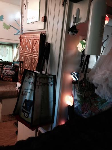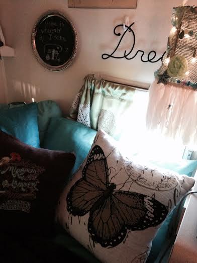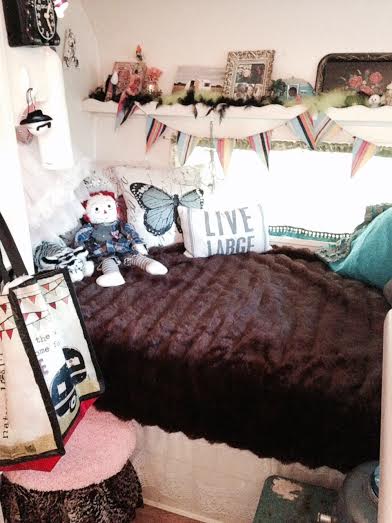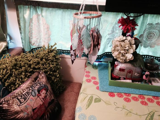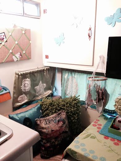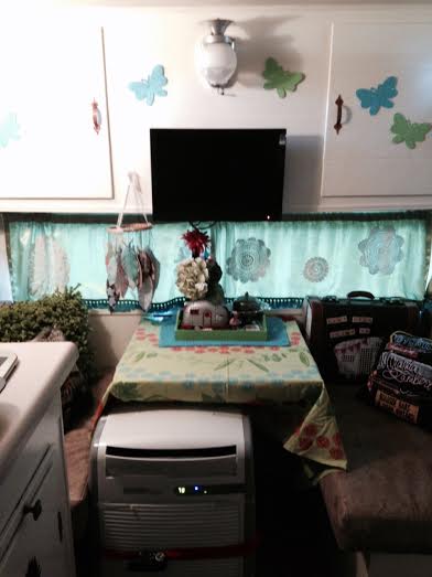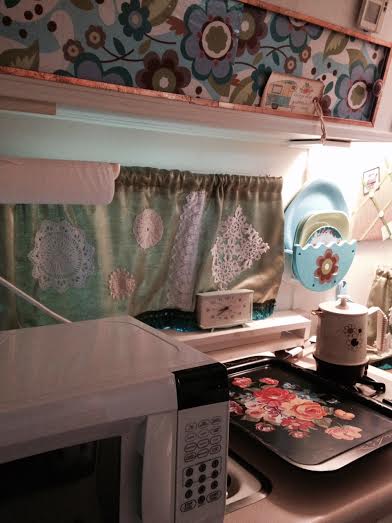This is the front of the trailer with its dinette that can be converted into a bed. My sister Brenda fashioned the curtains from shiny lime green drapes, turquoise and brown fringe donated by my other sister Sharon (who donated a pillow), and thrift store doilies! Aren’t they adorable?