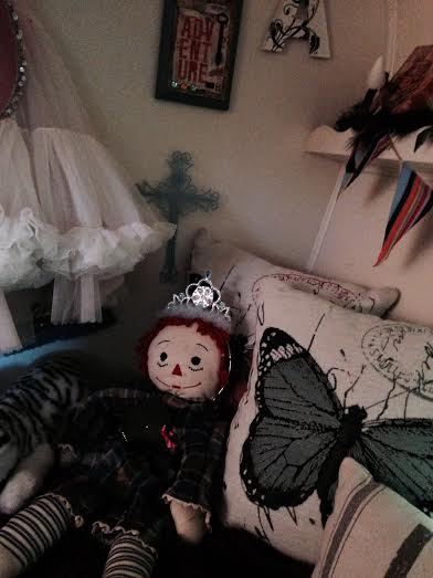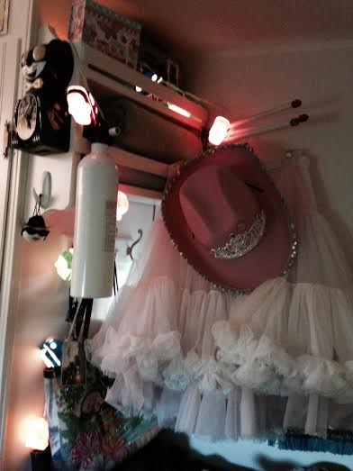 To the rear of the trailer is the bedroom, or boudoir. When I am camping, the vintage Coleman ice chest and water jug go outdoors. That frilly ruffly thing with the pink toilet seat cover is my potty!
